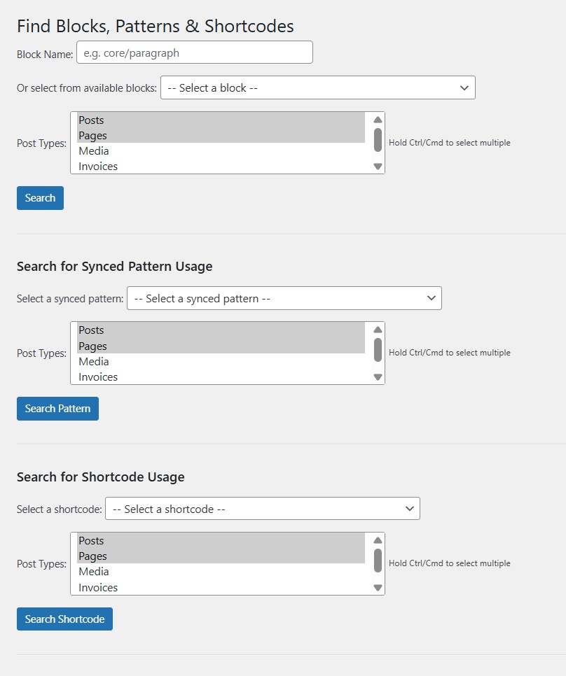 - Post type filtering – search across posts, pages, or custom post types to find blocks, patterns, and shortcodes