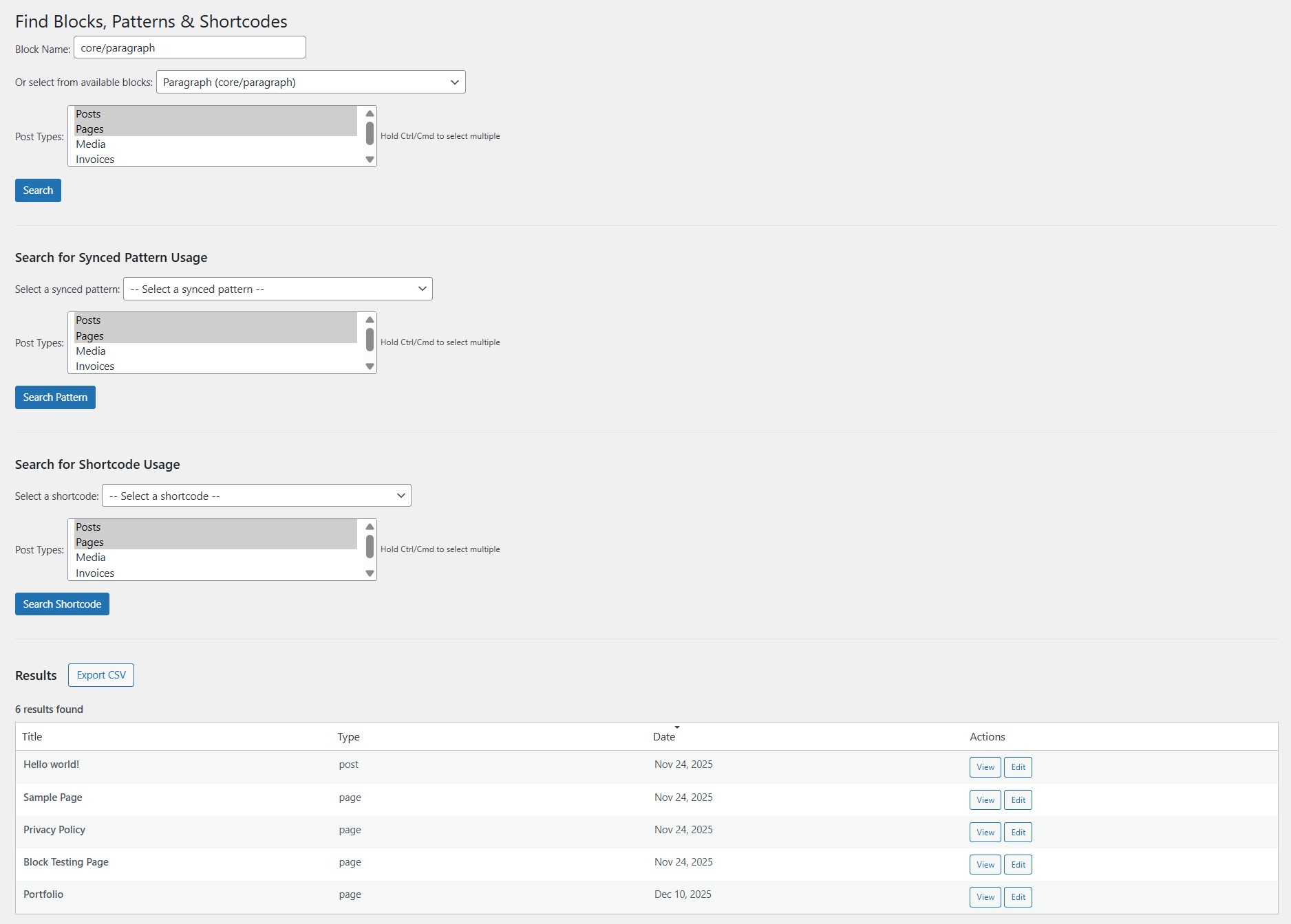 Find Blocks, Patterns & Shortcodes locates content containing specific Gutenberg blocks, with a CSV export feature perfect for audits & analysis.